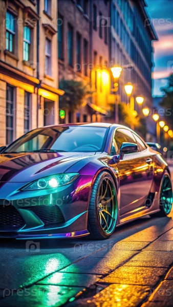 Современный настроенный автомобиль, припаркованный на городской улице в сумерках с яркими световыми фонарями города