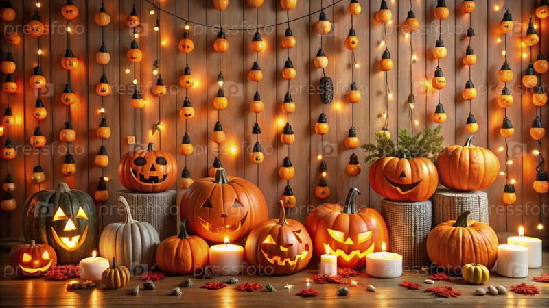 Очаровательный фонарий Хэллоуина с светящимися тыквами и праздничными украшениями