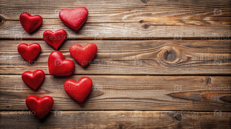 Красные сердца расположены на деревянном фоне для романтической обстановки