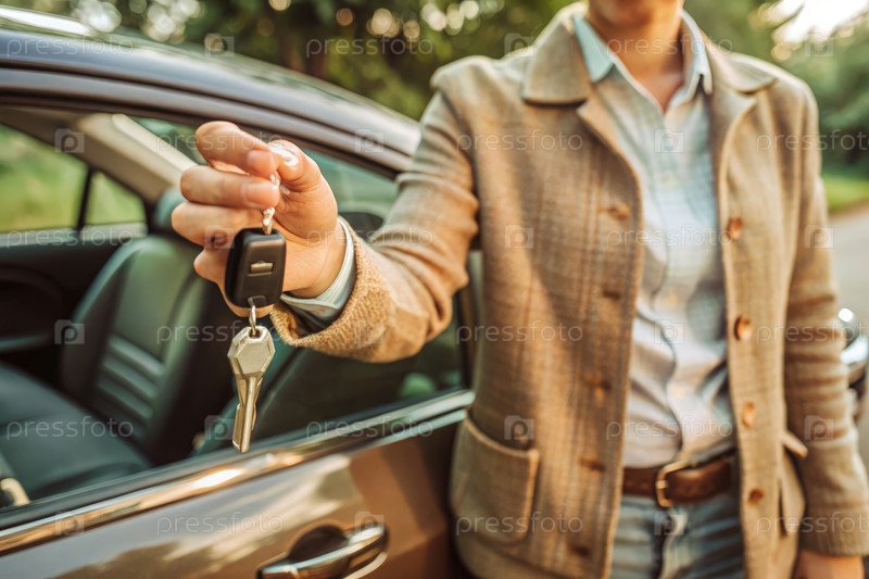 Человек держит ключи от автомобиля, стоя рядом с открытым транспортным средством в солнечный день