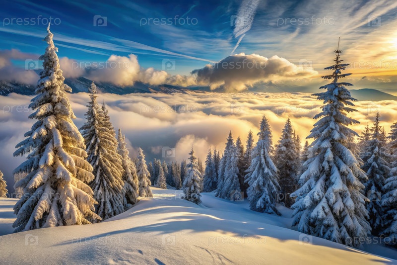Зимний восход солнца над снежным скоплением сосновых деревьев в горах