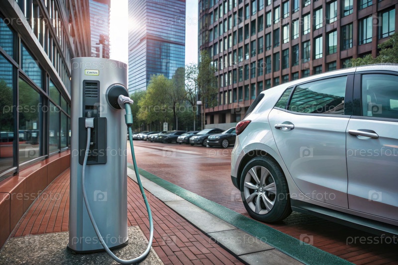 Электромобиль, заряжающийся на станции в центре города во второй половине дня при солнечном свете