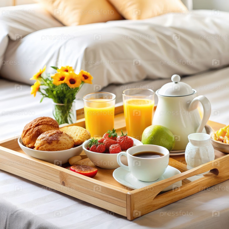 Вкусный завтрак в постели со свежими фруктами и выпечкой на утреннем свете