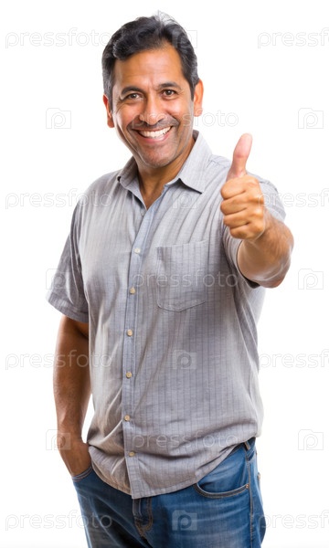 Счастливый латиноамериканец показывает большие пальцы в повседневной одежде на простом фоне