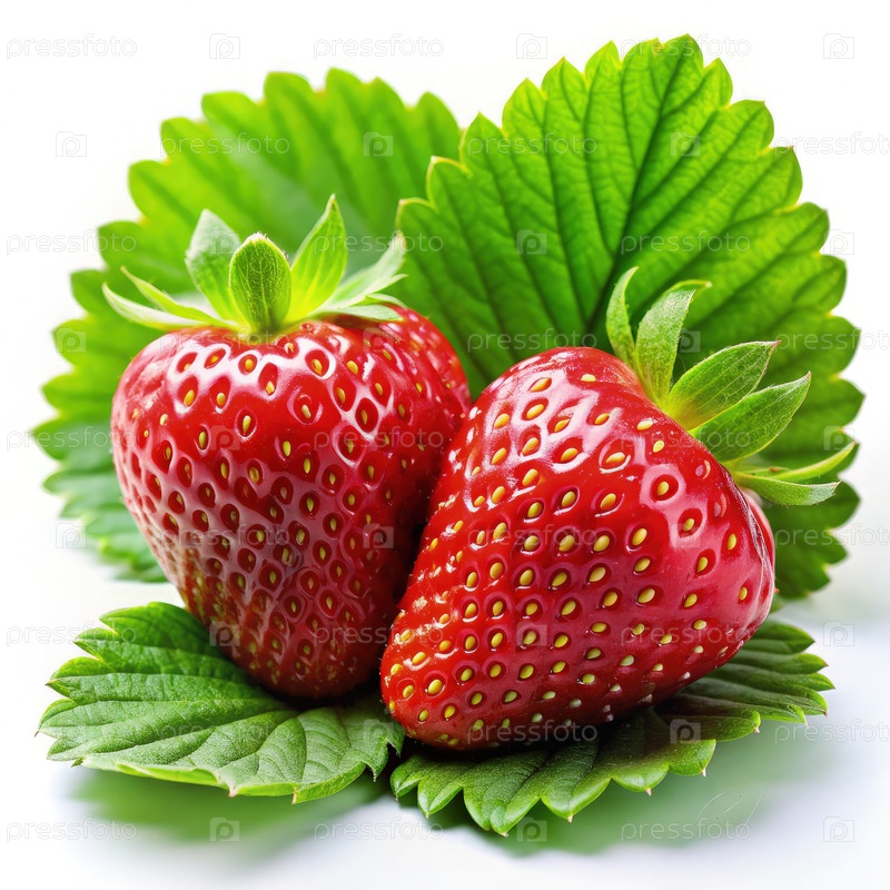 Глянцевые красные клубники, расположенные на ярких зеленых листьях при ярком освещении