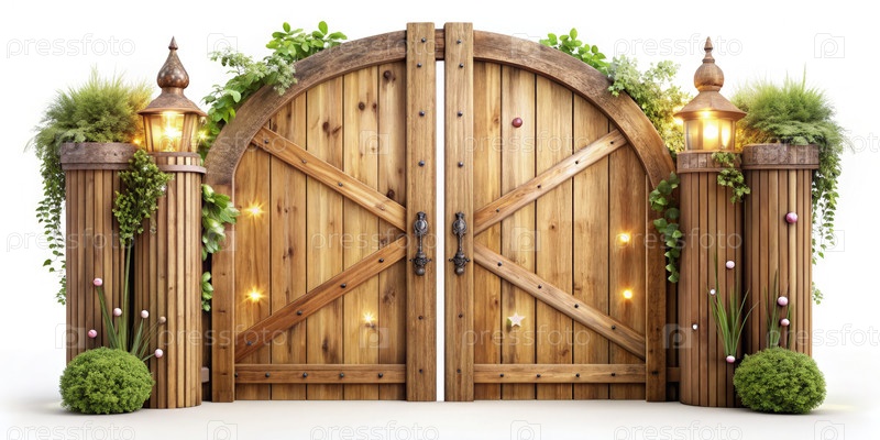 Очаровательные деревянные ворота, украшенные зеленью и фонарями в коттеджной обстановке