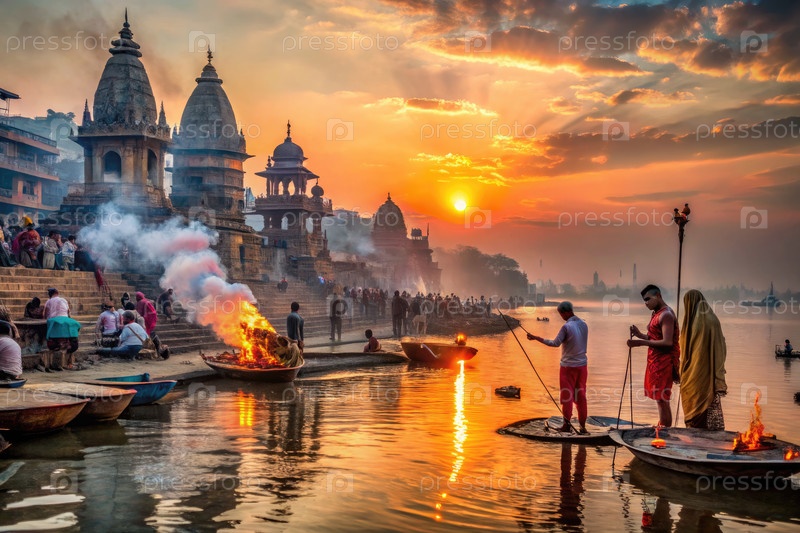 Кинематографический закат над горами Варанаси с ритуалами и лодками на закате