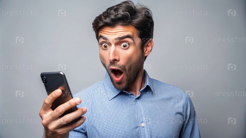 Человек реагирует в шоке при использовании мобильного устройства, запечатленного на нейтральном фоне