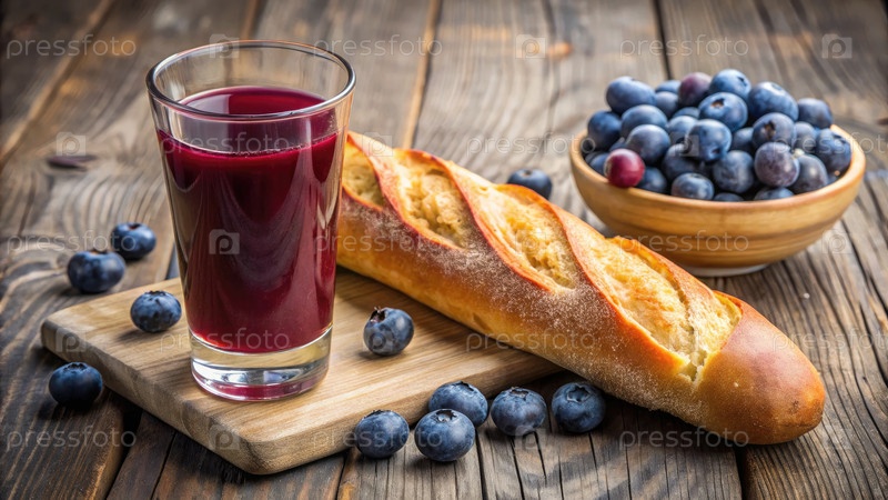 Свежевыпеченный багет стоит рядом с высоким стаканом, наполненным ярким ягодным соком черники