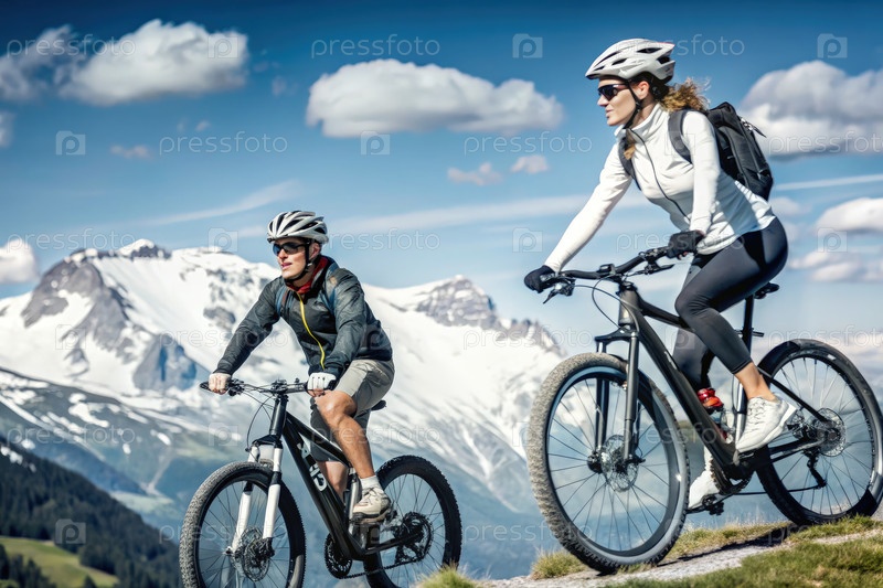 Молодая женщина катается на велосипеде по горной тропе в окружении живописных вершин