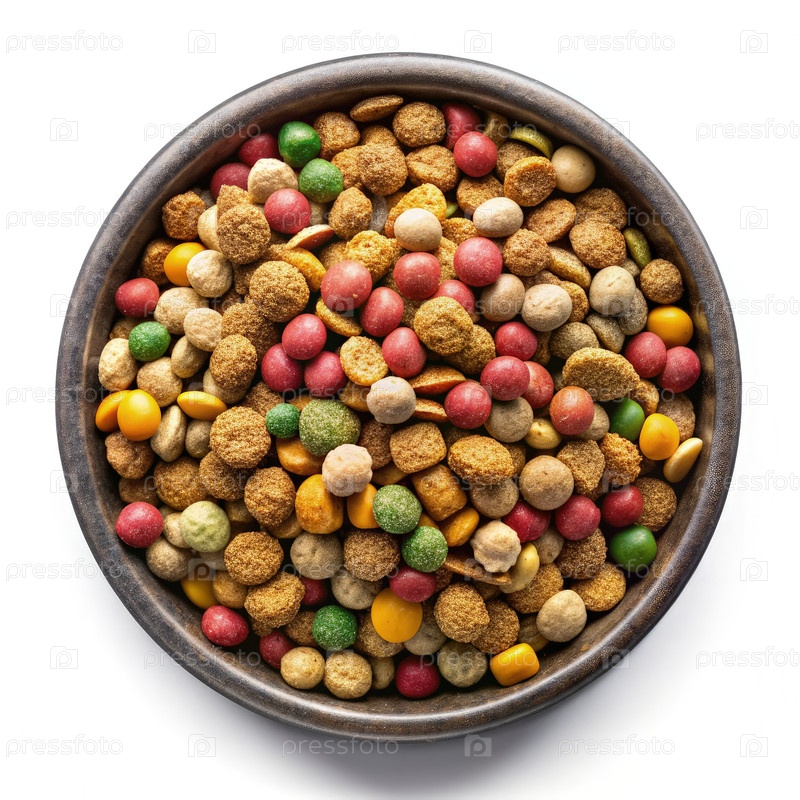Чаша, наполненная красочной пищей для домашних животных на чистом белом фоне