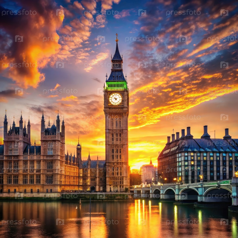Закат солнца над Биг-Беном и зданиями парламента в Лондоне
