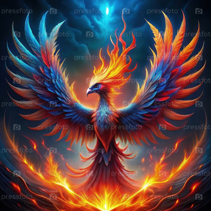 Сюрреалистический красный горящий феникс, взлетающий по яркому синему небу на закате