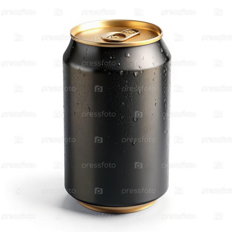 Черная пивная банка с золотой верхушкой помещена на белую поверхность с капельками воды. генеративный ИИ