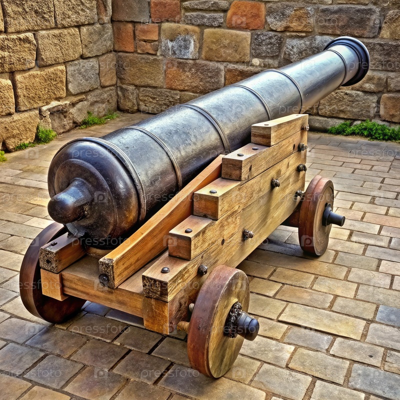 Средневековая пушка на деревянной повозке в каменном дворе днем