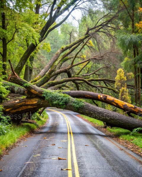 Падающие деревья блокируют дорогу в пышном лесу во время дождливой погоды