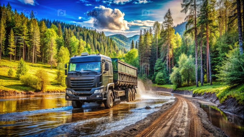 Грузовик едет по грязной лесной дороге, окруженной яркими деревьями