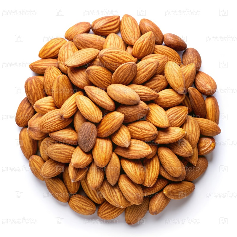 Вид сверху миндалей, аккуратно расположенных на белом фоне и показывающих текстуру и цвет