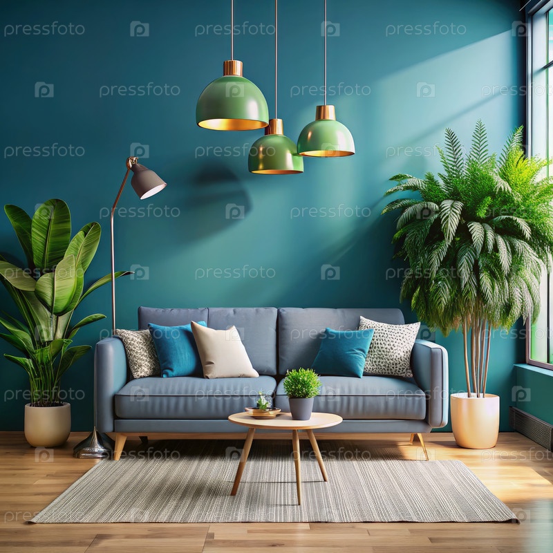 Современная гостиная оснащена диваном, растениями и подвесным освещением в ярком декоре