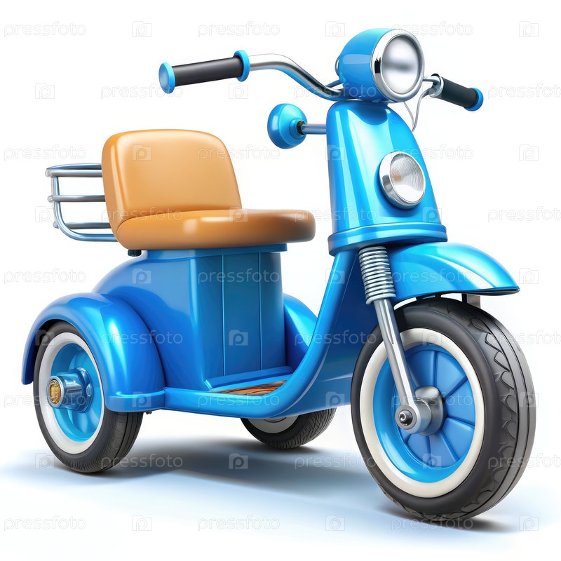 Синий мультфильм с моторизованным трехколесом на белом фоне, готовый к приключениям