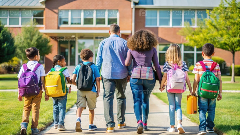 Студенты возвращаются в школу с рюкзаками рядом с учителем в солнечный день