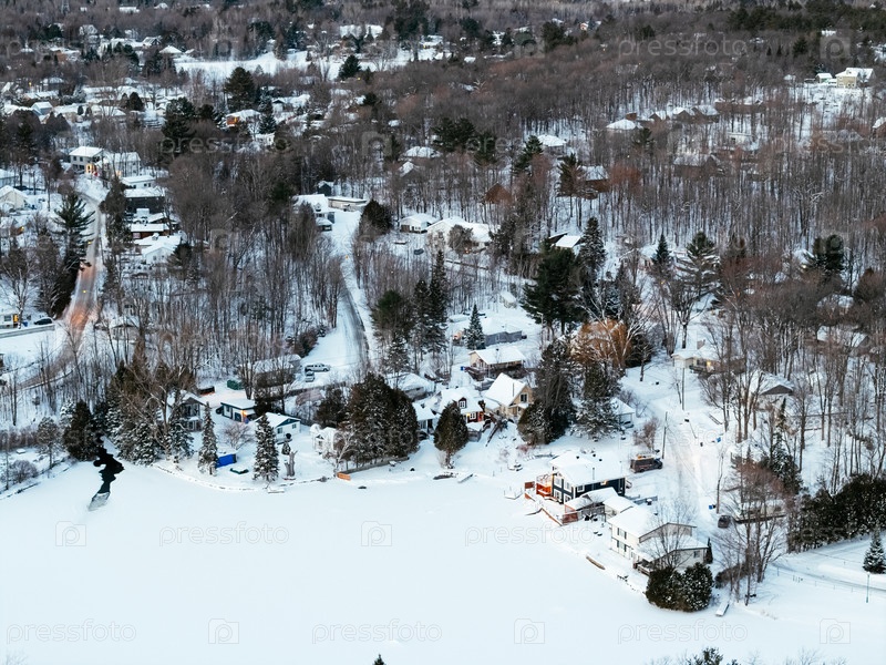 Зимний вид с воздуха на Сен-Жерре Квебеке со снежными домами и светящимися улицами в синее время суток. g