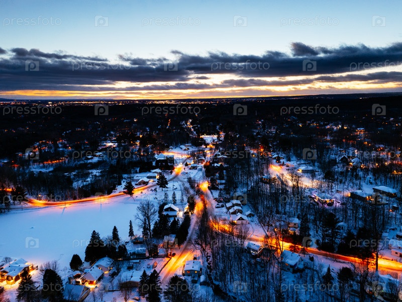 Зимний вид с воздуха на Сен-Жерре Квебеке со снежными домами и светящимися улицами в синее время суток. g