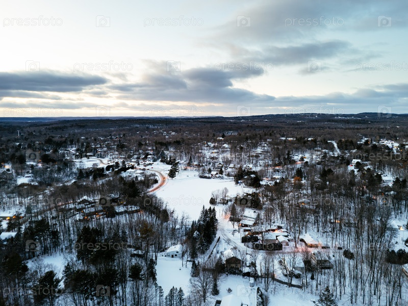 Зимний вид с воздуха на Сен-Жерре Квебеке со снежными домами и светящимися улицами в синее время суток. g