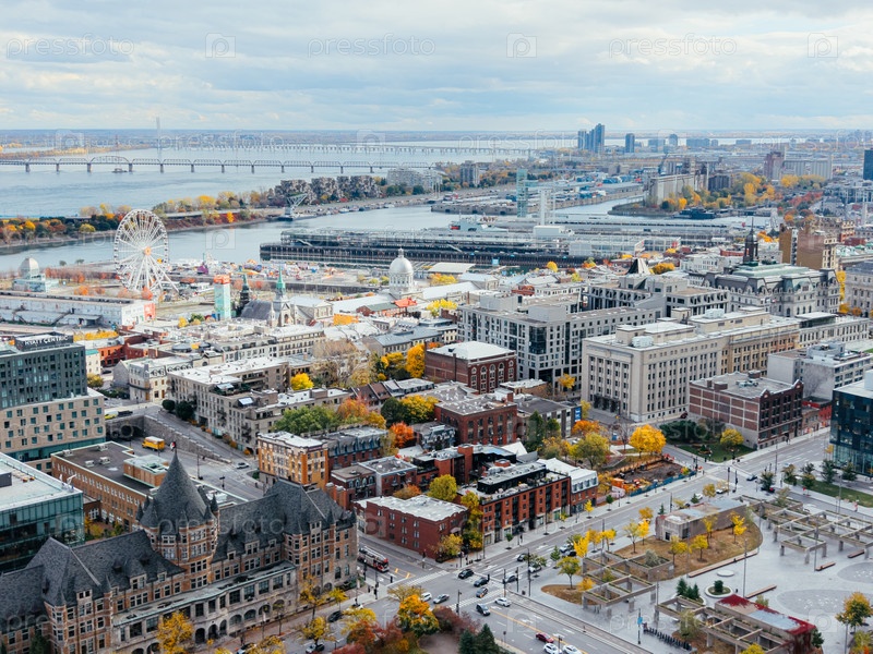 Вид из воздуха на Монреаль с мостами над рекой Сент-Лоуренс, цвета осени, Старый порт и гавань. g