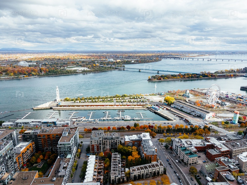 Вид из воздуха на Монреаль с мостами над рекой Сент-Лоуренс, цвета осени, Старый порт и гавань. g