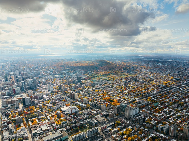 Вид из воздуха на Монреаль с мостами над рекой Сент-Лоуренс, цвета осени, Старый порт и гавань. g