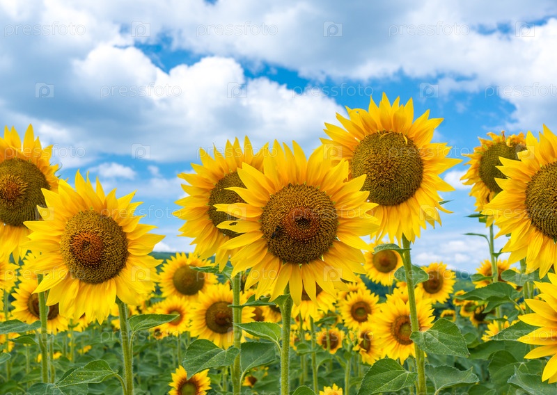 Поле цветущих подсолнечников на фоне неба