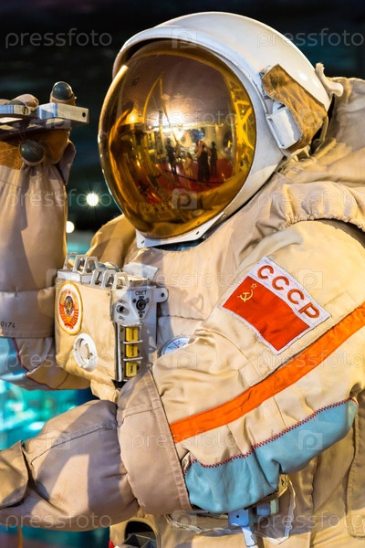 Москва, Россия - 31 мая 2016: Космический костюм российского астронавта в космическом музее