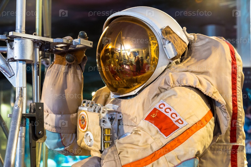 Москва, Россия - 31 мая 2016: Космический костюм российского астронавта в Московском космическом музее