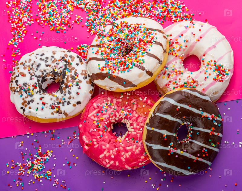 Пончики с глазуркой на цветном фоне. сладкие пончики. фон пончиков. съеденный пончик