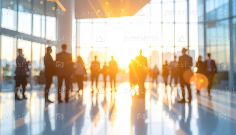 Размытые силуэты деловых людей, стоящих в современном офисном лобби с ярким солнечным светом, проходящим через большие стеклянные окна