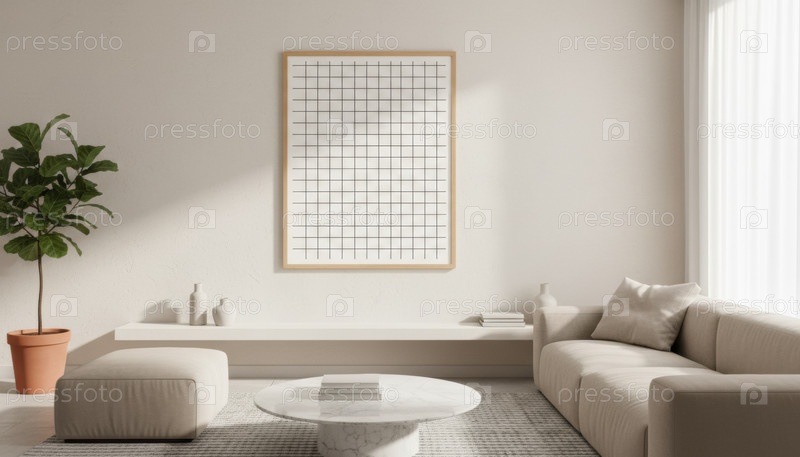 В современной минималистической гостиной есть бежевый диван и деревянная решетка с художественным принтом на белой стене с зеленым горшочным растением и мраморным кофейным столом