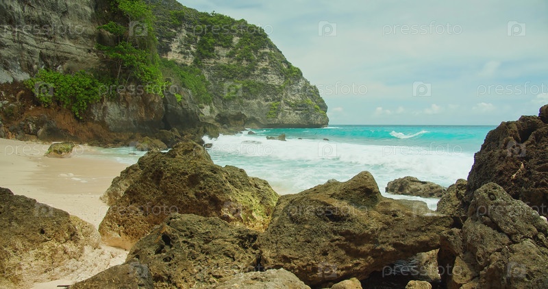 Плодородная растительность цепляется за крутые скалы над уединенным пляжем, где бирюзовые волны сталкиваются с грубыми скалами и вырезают береговую линию на протяжении тысячелетий