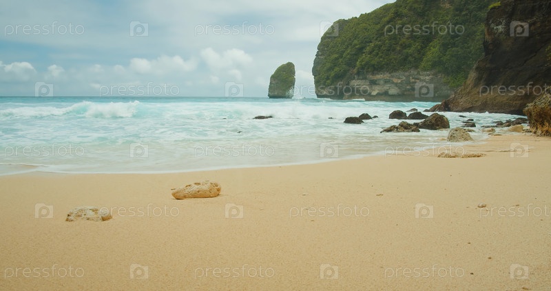 Пляж Тембелинг простирается привлекательно, с видом на знаковые скальные образования побережья Нуса-Пенида.Нежные волны обходят золотые пески Бали, мирную атмосферу этого тропического рая