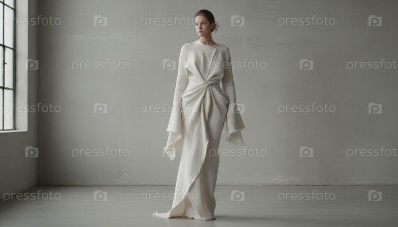 Элегантная модель, одетая в длинное мягкое белое льняное платье с драпированными деталями и широкими рукавами, стоит в сырой индустриальной бетонной студии