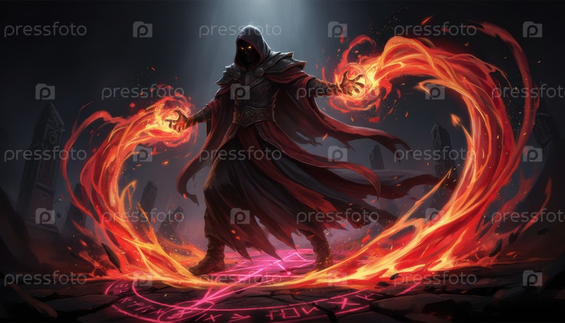 Злой колдун с капюшоном бросает магическое заклинание темного огня, окруженное светящимися таинственными символами на трещинах каменного пола