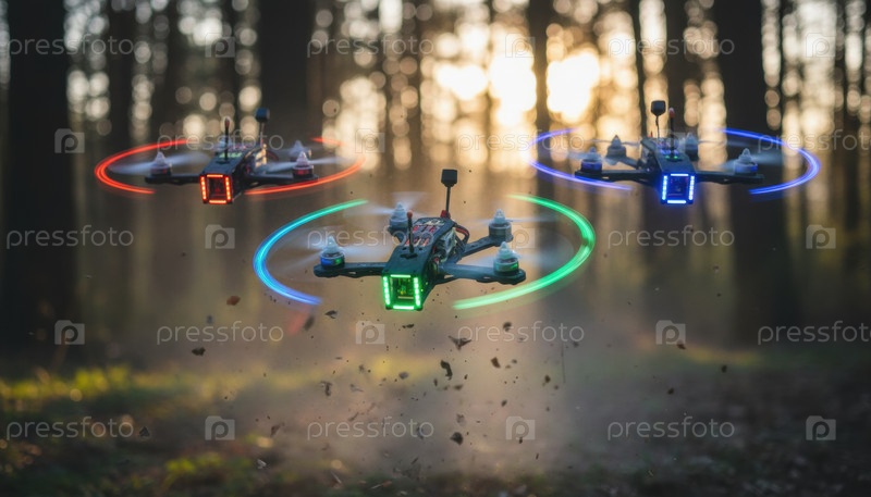Высокоскоростные гоночные дроны с яркими неоновыми светодиодными фонарями летают через темный туманный лесный пейзаж во время золотой часовой фотосъемки заката