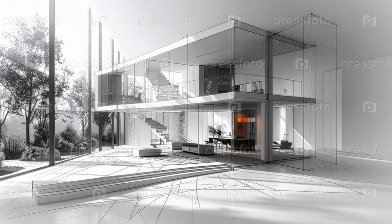 Архитектурный эскиз роскошного современного стеклянного дома с прозрачными стенами и внутренней мебелью