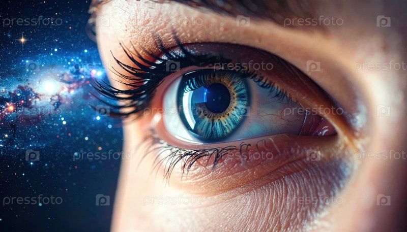 Макросъемка человеческого глаза, отражающая красочную галактику и звезды, представляющие видение будущего науки и космических открытий