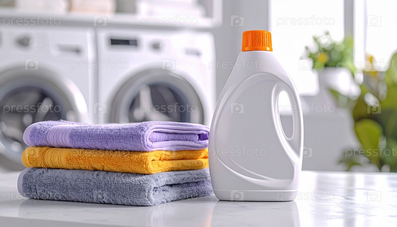 Бутылка моющего средства для стирки со сложенными полотенцами в ярком современном интерьере прачечной, символизирующей рутинную гигиену и уход за домашним хозяйством