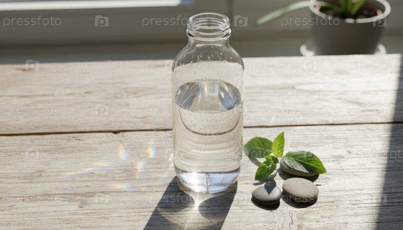 Стеклянная бутылка под солнцем на деревянном столе, представляющая собой простоту оздоровления и тенденцию устойчивого образа жизни в спокойной современной домашней среде