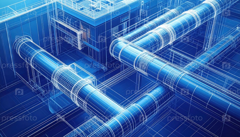 Сложный синий промышленный план сложной трубопроводной системы, показывающий техническое инженерное проектирование для инфраструктуры энергетических объектов