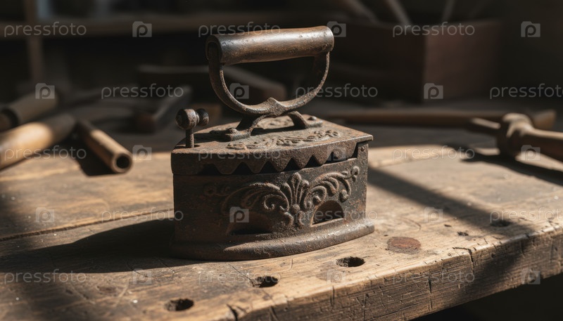Старые чугунные литья с украшенными деталями на деревянном рабочем столе в пыльной мастерской метафора ностальгии ремесленничества медленного проживания винтажного домашнего декора и семейного наследия