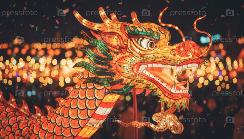 Традиционный китайский дракон фонарь, освещаемый ночью во время праздника лунного Нового года с конфетти и огнями боке