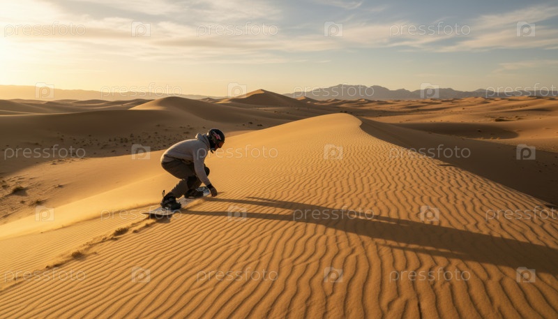 Приключенческий песочница, скользящий вниз по крутым золотым песчаным дюнам в пустынном пейзаже под обширным небом во время живописного путешествия на закате